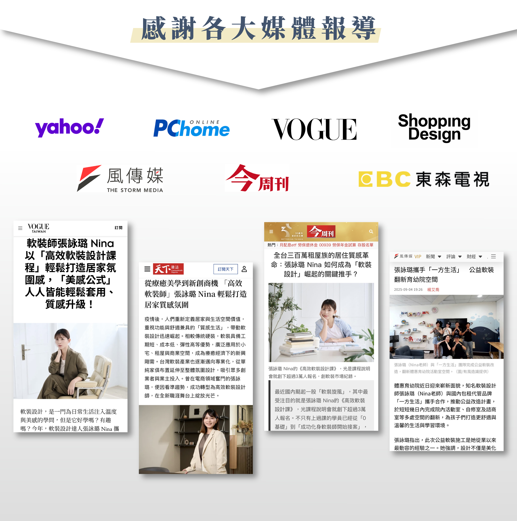 上完這堂軟裝課,我現在慢慢開始接案,幫租屋族、學生族做輕改造,一邊累積作品、一邊把熱愛的事變成副業,覺得生活真的開始不一樣了。